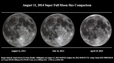 I waited for the Perigee Full Moon aka Super Moon this morning at around 2:09am to image the biggest Perigee Moon for the year 2014. This is not only the closest and the largest full moon of the year. It also presents the moon’s closest encounter with Earth for all of 2014. The Moon will not be this close again until the full moon of September 28, 2015. I also made a comparison image of this morning's Perigee Full Moon against the Full Moons of July 12, 2014 and April 15, 2014. All 3 images were taken using same lens so I can make more accurate size difference. I used a Canon EOS 500D DSLR camera with Canon EF 100-400mm f/4.5-5.6 IS L lens set at 400mm f/11.