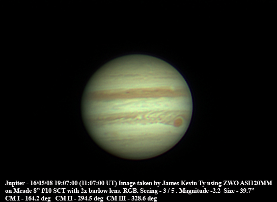 The sky this early evening is clear and I force myself to do some planetary imaging which i plan top image Jupiter , Mars and Saturn this evening. I'm not a real planetary imager but as a novice, I'm eager to try some planetary imaging once in a while. For this early evening, I started to image the gas giant Jupiter which is already high in the early evening and I was able to cool down my scope as well. Seeing condition is fair and I was able to see the Great Red Spot (GRS) nearing the limb. A great feeling indeed to be able to image the great planet Jupiter once again :)RGB image taken using Meade 8" f/10 SCT with ZWO ASI120MM webcam with 2x barlow lens.