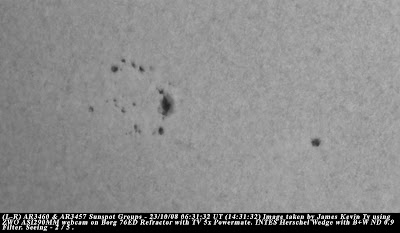 The sky around lunchtime is clear and seeing condition is good. AR3465 Sunspot Group together with AR3464 Sunspot Group are the bigger groups on the Sun's disk. AR3460 Sunspot Group is nearing the western limb. Not much flaring activity on the 2 big groups while there is also a nice large hedgerow prominence in the SW limb.